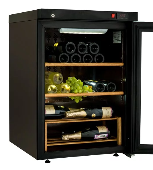 Обшивки корпусов шкафов – снаружи и изнутри - выполнены из оцинкованной, окрашенной в мягкий коричневый цвет, стали. Рама дверей – из алюминия черного цвета. Стилистически шкафы соответствуют традиционному восприятию оборудования для экспозиции премиальных напитков и органично поддержат концепцию винного погреба.