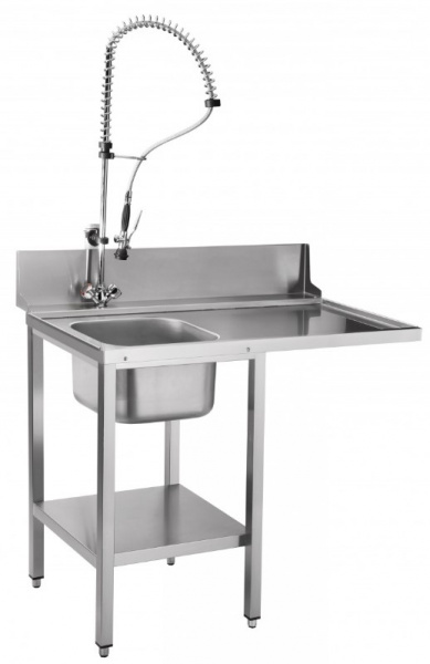 Стол предмоечный СПМФ-7-1 (1166х724 мм) душ-стойка, мойка цельнотянутая 400х400х250, для фронтальных машин МПК-500