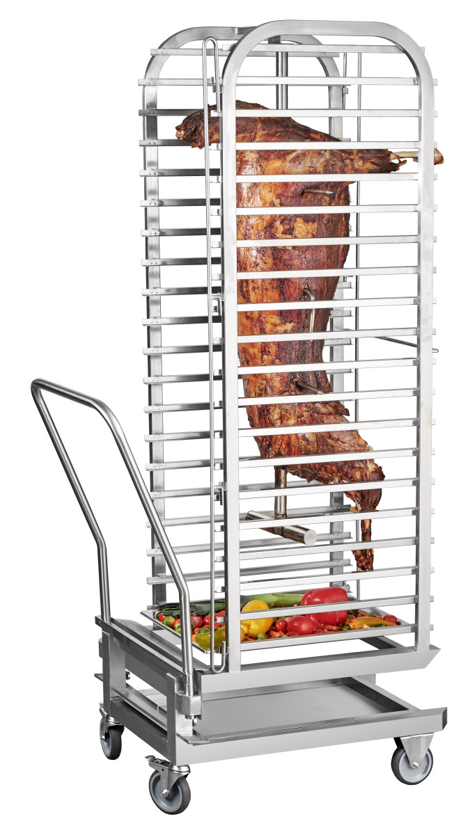 Тележка для пароконвектомата ТП 20-1/1 является вспомогательным оборудованием, вмещает 20 гастроемкостей размером GN 1/1 и используется для их транспортировки и установки в 20-ти уровневом пароконвектомате типа ПКА 20-1/1. Имеет съемную ручку для транспортировки и поворотные колеса. Изготовлена из нержавеющей стали.