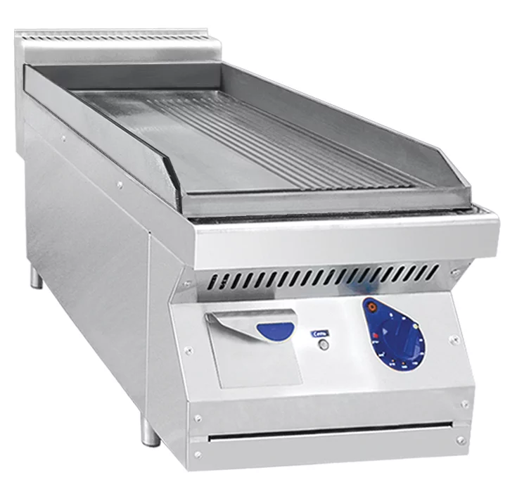 Все регуляторы и контрольные лампы находятся на передней панели. Терморегулятор позволяет поддерживать температуру поверхности от +30 С до +270 °С. Поверхность для обжарки имеет желоб для стекающей жидкости и снабжена по периметру бортиком, позволяющим предотвратить разбрызгивание жира.