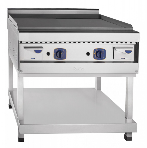 Газовый аппарат контактной обработки ГАКО-90/1П-С-01, гладкая стальная поверхность 834х703 мм, 900 серия, 840х900х950 мм, пьезорозжиг, газ-контроль, 16 кВт, на подставке с полкой, вся нерж. предназначен для приготовления стейка, рыбы, блинов, омлета и т.п. путем непосредственного контакта греющей поверхности с пищей.