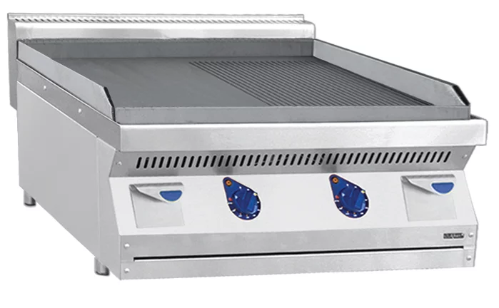 Аппарат контактной обработки АКО-80/1Н-С-00, стальная поверхность 790x650 мм, 1/2 гладкая - 1/2 рифленая, 700 серия, 802х750х470 мм, 9 кВт, 400 В, настольный, вся нерж. предназначен для непосредственной жарки мясных, рыбных и овощных блюд.