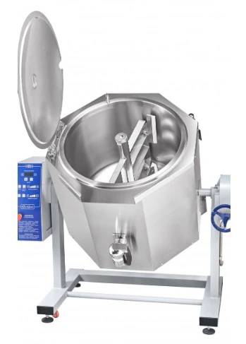 Котел пищеварочный электрический КПЭМ-100-ОМР-ВК со сливным краном, 100 л, миксер 0-120 об/мин (10 шагов, нижний привод, реверс), +125 °С, пар. рубашка, ручное опрокидывание, цельнотянутый