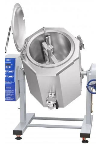 Котел пищеварочный электрический КПЭМ-60-ОМР-ВК со сливным краном, 60 л, миксер 0-120 об/мин (10 шагов, нижний привод, реверс), +125 °С, пар. рубашка, ручное опрокидывание, цельнотянутый