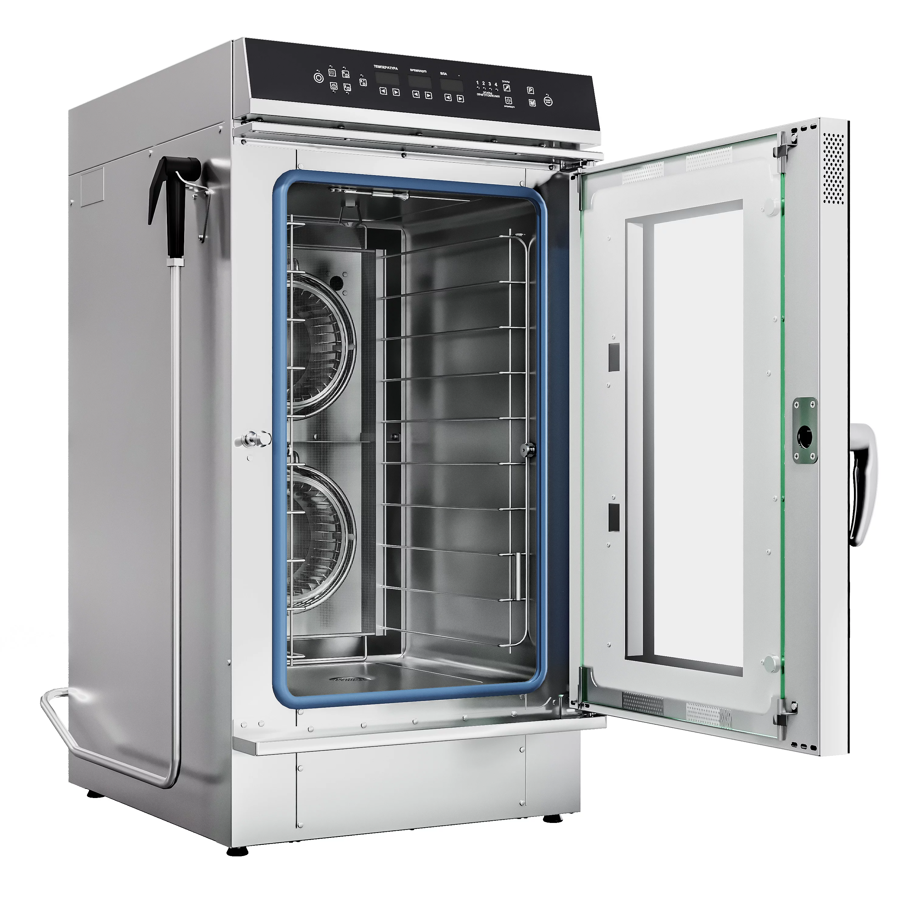 Верхняя панель управления (парогенератор, 10хGN-2/3, память на 110 программ приготовления, термощуп, регулировка влажности, 3 режима автоматической мойки с декальцинацией парогенератора + ополаскивание водой, ручной душ в комплекте, вся нерж, без г/емкостей) черный дизайн, реверс, 230 В