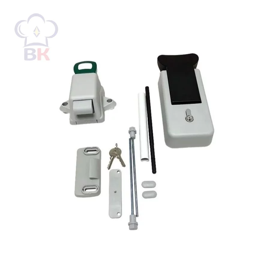 Состоит из двух частей: наружной и внутренней. Детали ручки изготовлены из жёсткого ударопрочного пластика. В наружной части есть рычаг для открывания двери и замок с 2 ключами, во внутренней части - рычаг аварийного открывания двери (открывается при закрытом замке). Части соединяются двумя болтами (входят в комплект) через три отверстия в полотне двери.